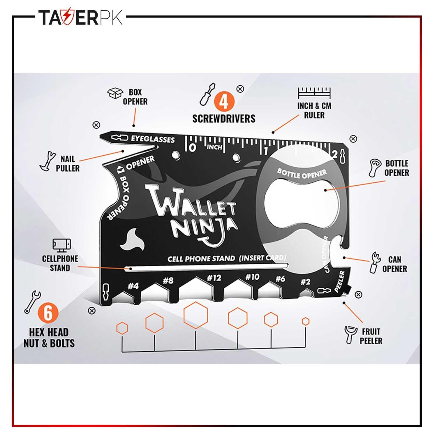 Wallet Ninja Multitool Card â 18 in 1 Credit Card Multi-Tool (Bottle Opener, Can Opener, Screwdrivers, Phone Stand & More) â Black